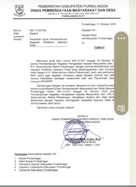 PURBALINGGA | PNN NEWS – 1/11/2025 –Dalam waktu hanya dua hari, Dinas Pemberdayaan Masyarakat dan Desa (Dinpermasdes) Kabupaten Purbalingga menerbitkan dua surat berbeda yang sama-sama berkaitan dengan kegiatan Pengabdian kepada Masyarakat atas nama UIN KH. Abdurrahman Wahid Pekalongan.