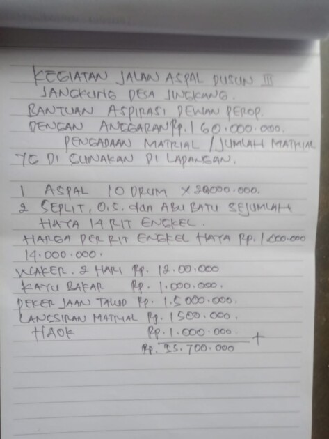 “Dari hasil perhitungan saya, masih ada sisa sekitar 100 juta rupiah. Karena saya mencatat semua material yang dibelanjakan, dan SPJ-nya dibuat oleh pihak desa, bukan oleh pihak ketiga. Kalau dilihat dari volume pekerjaan yang ada, paling hanya sekitar 60 juta rupiah yang digunakan. Bahkan saya menduga aspal banyak yang hanyut terbawa air karena kualitas pekerjaan yang buruk,” tambahnya.