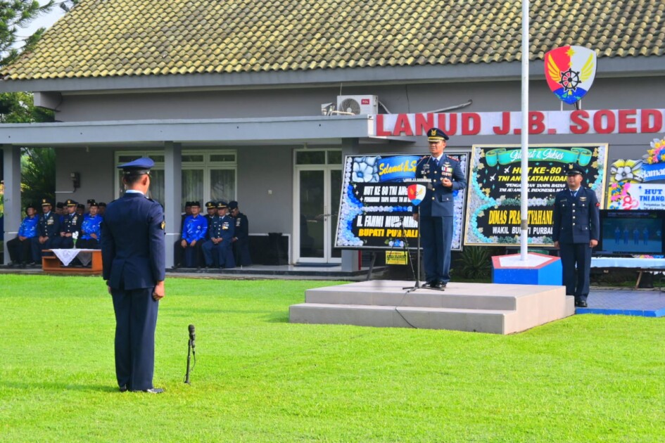 PURBALINGGA | PNN NEWS — Peringatan Hari Ulang Tahun (HUT) ke-80 TNI Angkatan Udara (TNI AU) tahun 2026 di Lanud Jenderal Besar Soedirman berlangsung khidmat, tertib, dan sarat nilai pengabdian. Upacara digelar pada Kamis, 9 April 2026, pukul 07.20 hingga 08.25 WIB di Lapangan Mako Lanud Jenderal Besar Soedirman, dengan mengusung tema “Pengabdian Tanpa Batas, TNI AU AMPUH Indonesia Maju.”